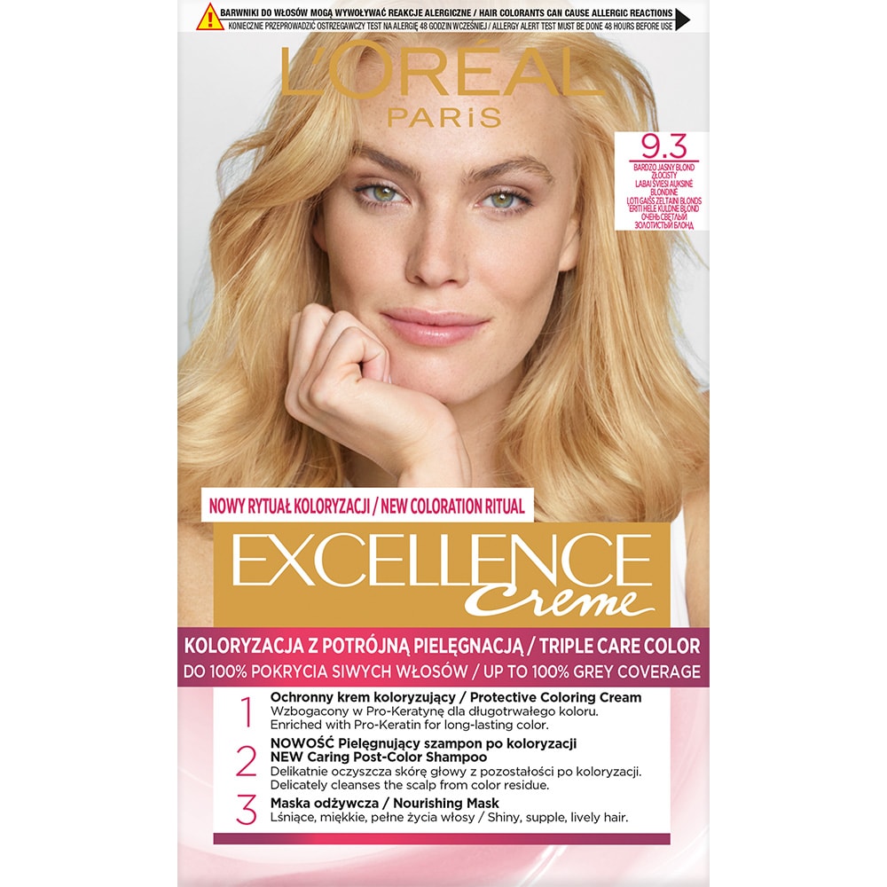 Püsivärv, mis hoolitseb sinu värvi, peanaha ja juuste eest ning katab kuni 100% hallid juuksed. • Kolmekordse toimega juuksevärv • Katab hallid juuksed kuni 100% • Kauapüsiv ja särav värvitoon • Salongist inspereeritud hooldus • Armastatud 99% vastajate poolt* L'Oréal Paris‘ juuksevärvi Excellence Crème saladus peitub tõhusate toimeainete ainulaadses koosluses ja kolmekordses toimes. Excellence hoolitseb sinu värvi, juuste ja peanaha eest ning katab kuni 100% hallid juuksed. Värvitoon on rikkalikult sügav, särav ja püsib kaua. Juuksed on toidetud ja elujõulised. *tarbijauuring 342 osalejaga
