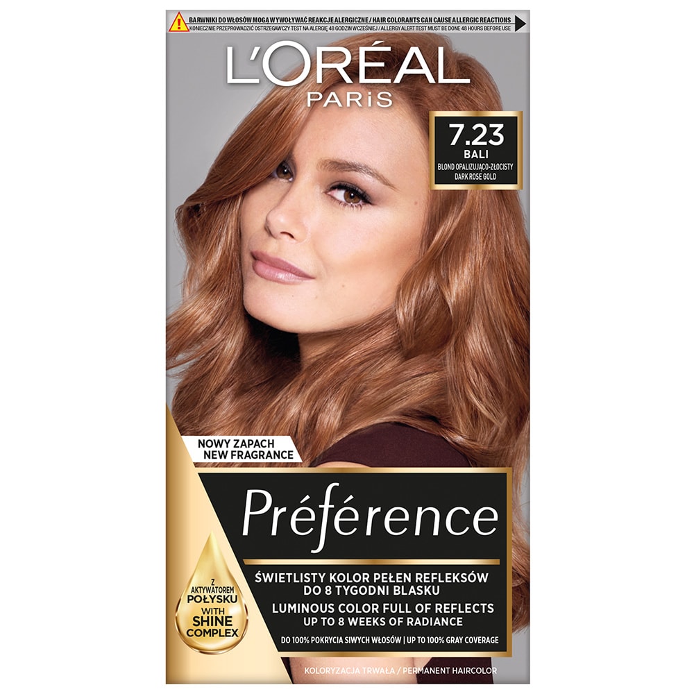 Püsivärv, mis annab juustele küllusliku peegeldusega värvitooni ja kuni 8 nädalat säravat tulemust*. • Esmaklassiline kvaliteet juuste värvimisel • Küllusliku peegeldusega värvitoon • Särav tulemus kuni 8 nädalat* • Katab hallid juuksed kuni 100% • Merevaigunootidega lillelõhn Préférence – see on premium kvaliteediga värvimine ja erksad toonid Pariisi moepoodiumitelt! Avastage Préférence’i ainulaadsed toonid valgust peegeldavate värvidega ja nautige tuhmumiskindlat ning säravat värvitooni. Ilusad siidsed juuksed sügava värvitooniga ja kuni 8 nädalat särava tulemusega* peale värvimist ning hallikatvus kuni 100%! *Instrumentaalne katse.