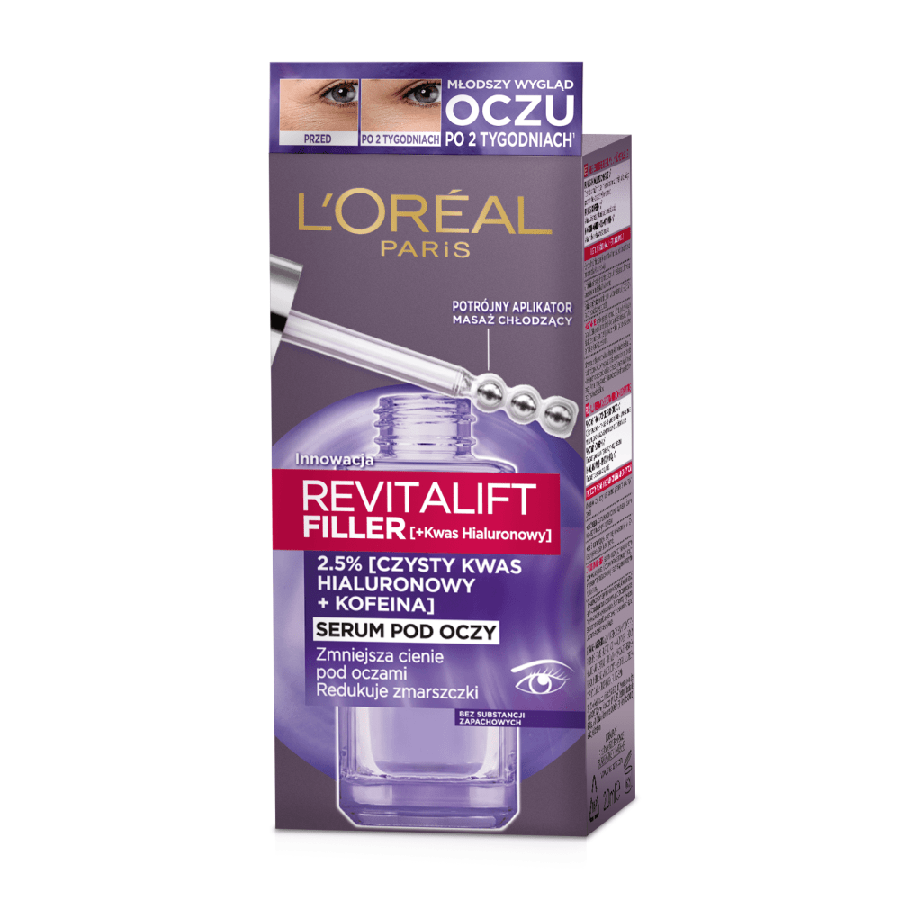 Meie esimene silmaseerum, mis sisaldab 2,5% puhast hüaluroonhapet ja kofeiini. Puhas hüaluroonhape toetab naha intensiivset niisutust ja vähendab silmaümbruse kortse, puhas kofeiin aga aitab vähendada tumedaid silmaaluseid. Koostis sisaldab niatsiinamiidi ja Cg-vitamiini – need toimeained aitavad muuta silmaalust nahka säravamaks, andes tulemuseks värskema välimuse. Seerumil on kolme rullikuga metallist aplikaator, mis pakub jahutavat massaaži ja vähendab silmalaugude turset. Tulemused? Kohe: silmaümbruse nahk on nähtavalt niisutatud ja silmade välimus on palju värskem. Kahe nädala pärast: silmaalused kortsud on siledamad. Silmaaluste tume toon on nähtavalt vähenenud. Kuue nädala pärast: silmaümbruse kortsud on vähenenud (-21%)*. 92% naistest soovitaksid seda toodet ka teistele**.